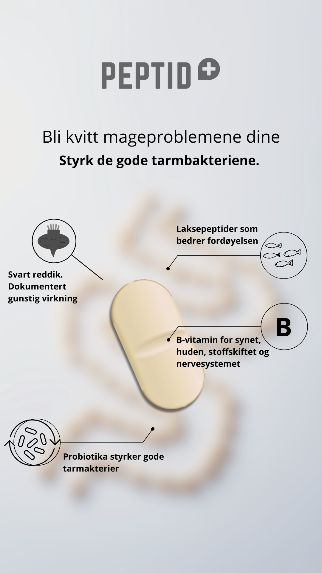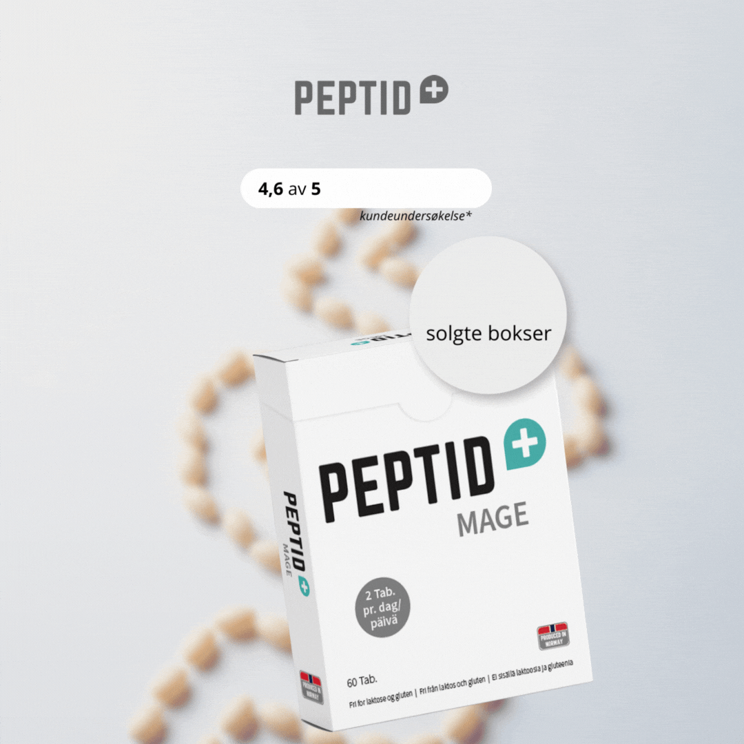 Ny forskning har gitt oss ny innsikt i hvor viktig mage og tarm er for kroppens vitale funksjoner. Dårlig fordøyelse går naturligvis også ut over trivselen, mens stress og dårlig trivsel også kan påvirke mage og tarm. Dette kan fort bli en vond sirkel som det er vanskelig å komme ut av. Peptid+ mage er et unikt kosttilskudd som er laget for å styre deg og fordøyelsen din i riktig retning. Peptid+ mage er produsert i Norge under streng kvalitetskontroll, med rene, trygge og testede ingredienser.